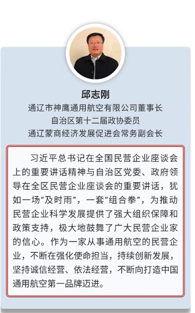 通遼市神鷹通用航空有限公司董事長、自治區(qū)政協(xié)第十二屆委員會委員邱志剛,作為自治區(qū)企業(yè)家代表應(yīng)邀參加了此次座談會。會后,按照自治區(qū)統(tǒng)戰(zhàn)部的統(tǒng)一部署,提交了參加座談會的收獲與感受,表示:一定要認(rèn)真貫徹布小林主席講話精神,不斷在強(qiáng)化使命擔(dān)當(dāng),持續(xù)創(chuàng)新發(fā)展,堅(jiān)持誠信經(jīng)營、依法經(jīng)營上下功夫,不斷向中國通用航空第一品牌邁進(jìn)。